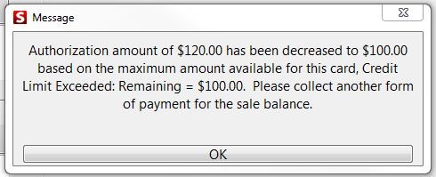 Note: This auto-adjustment happens immediately upon entering the card number on the Credit Card dialog in order to facilitate the speed of In-House Cards transaction. The operator does not have to wait until after clicking Finalize/Save/Pay to find that the amount to be charged to the card exceeds the available balance. All credit limits, daily spending limits, total spending limits and invoice balances are checked when the auto-adjustment is calculated. For instance, a sale total is $100. The card swiped for payment has an available invoice balance of $250. But, the card also has a daily spending limit of $50. The amount to be charged to the card is adjusted to $50.