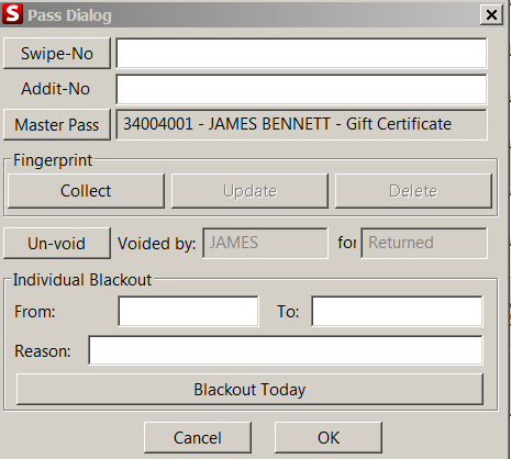On Guest Lookup > Pass Inquiry > edit pass > Modify there are three new buttons on the Pass dialog for collecting, updating and deleting fingerprints associated with a IHC item. If the IHC item does not have a fingerprint associated, the Collection button is active unless the operator does not have the security permission to do so. If the IHC/pass has a fingerprint associated the Update and Delete buttons are active if the operator has the security permissions to use them.
