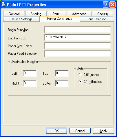 If the characters do appear in the text file, verify that they are correct by checking the programmer’s/developer’s/user’s manual. If they are correct, it’s possible to test them out within the printer driver. For example, to test the cut code for a Star TSP600 in the printer driver, open the printer driver properties and switch to the Printer Commands. Two fields here can be used for testing control codes: Begin Print Job and End Print Job. When testing font formatting changes, it is recommended to use the Begin Print Job field; for cut codes, use the End Print Job field.