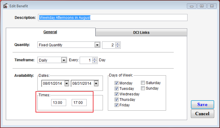 Note: benefits configured with Time Availability restrictions (e.g., see screen capture below) only work when sold at a regular salespoint. They do not work when selling them in E-Commerce module.