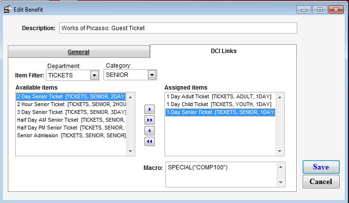 • Macro box - Similar to the Item/Pass Relationships tab, the item can be discounted by specific percentage when the member benefit is redeemed.