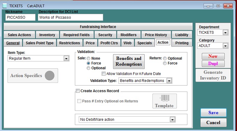 On the Action Specifics dialog a new Assigned Benefits tab, allows you to select the benefits to be assigned to a Memberships/Passes product. The benefits listed are retroactive, so that as new exhibits, lectures, discounts, etc., are introduced, they can be added to existing memberships.
