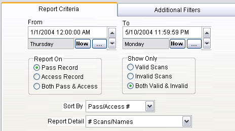 Provides detailed information per scan (such as operator and location). Can be sorted several ways and run for access and/or pass records as well as valid and/or invalid scans.