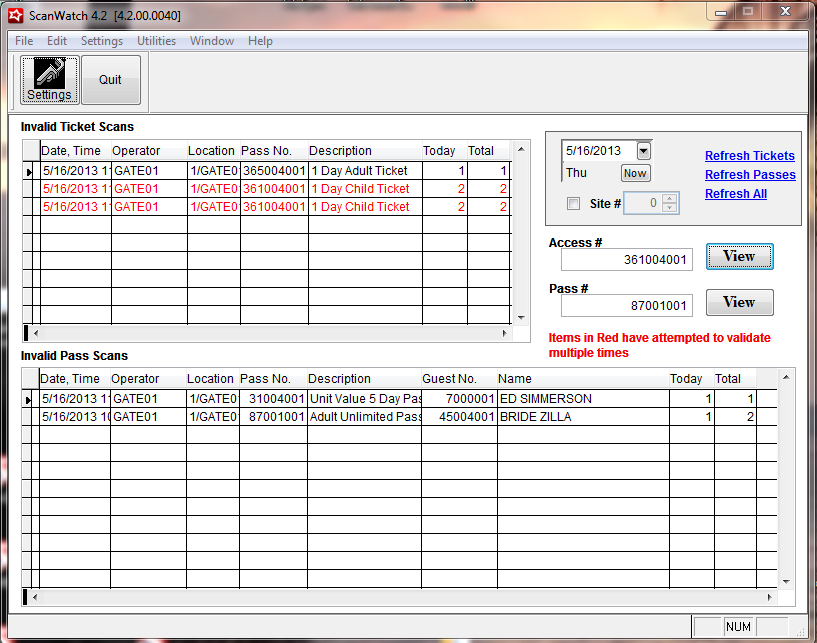 ScanWatch is a utility that can be used to monitor invalid scan activity for both access and pass records when using the Salesware Access Control functionality (scanning passes and tickets with either ScanMan or GateKeeper modules). Detailed scan history for a pass or access record may be viewed by double-clicking on one of the scan log records or by entering the access or pass number in the entry boxes provided.