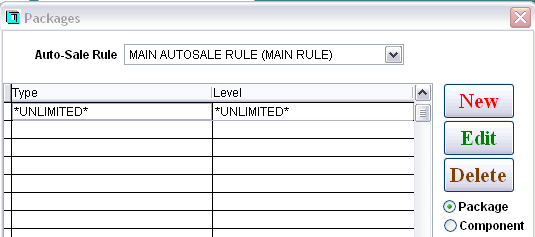 In a pay-upon-return process, the rental package configuration (also referred to as the rental contract item) is very simple. It consists of creating a rental package that uses the *UNLIMITED* rental component. In order to generate the auto-sale of the appropriate modifiers based on rental activity, the appropriate Auto-Sale Rule is also selected. As many rental contract items as necessary may be configured based on variances in Auto-Sale Rules per rental shop.