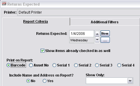 The Returns Expected Report can be used to generate a list of equipment that is due on or before a particular date. It can also show those items due back on the date specified that have already been returned in order to provide a “big picture” of the total returns expected compared to the total number already returned.