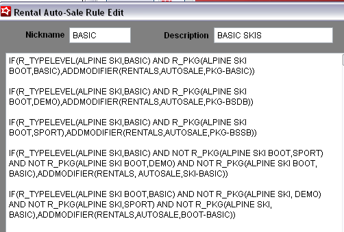• The first line says, if the inventory attached is a type and level of ALPINE SKI, BASIC and there is also an ALPINE BOOT, BASIC piece of inventory attached to the form, add the Basic Ski Package modifier (the RENTALS, AUTOSALE, PKG-BASIC item).