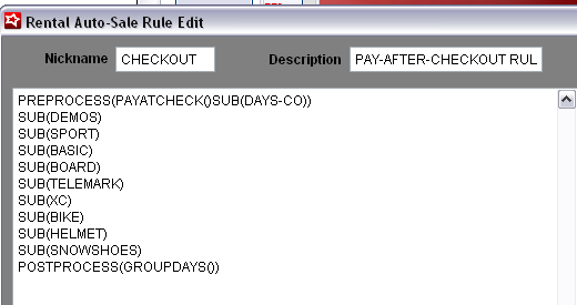 • The POSTPROCESS says, to group the same modifier DCIs into a single line and add the number of days to that line. This goes back to the example of a single modifier of BASIC SKI PACKAGE with a description of 3 FULL DAYS instead of having three separate BASIC SKI PACKAGE modifiers each with a description of 1 FULL DAY added to the Rental Contract item.