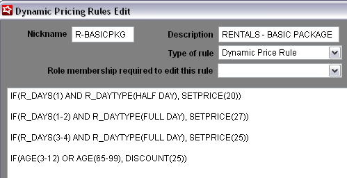 • The first line says if the number of rental days = 1 and the type of day is HALF DAY (these are from our Days definitions we set during the Rental Auto-Sale Rule configuration), set the per day price to $20.