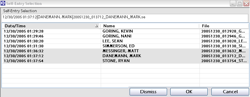 When an operator clicks the Import Self Entry button, a list of all available Self Entry records is displayed. One guest at a time may be selected or multiple records may be selected by holding the Ctrl key while selecting multiple guests. Once the guests have been selected, items of the specified DCI are added to the sale, each with the corresponding guest record attached. The Dismiss button can be used to delete Self Entry records from the queued list.