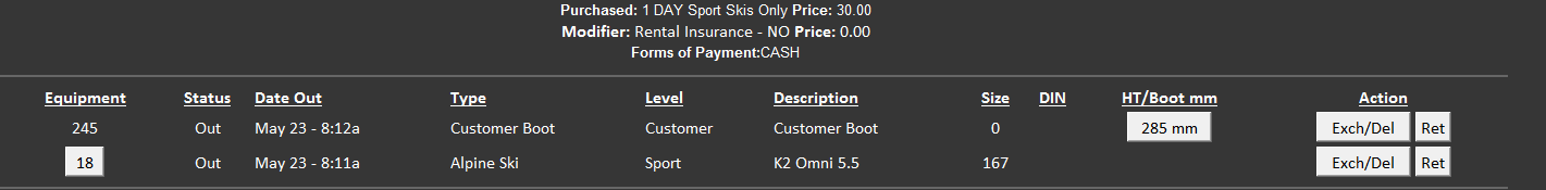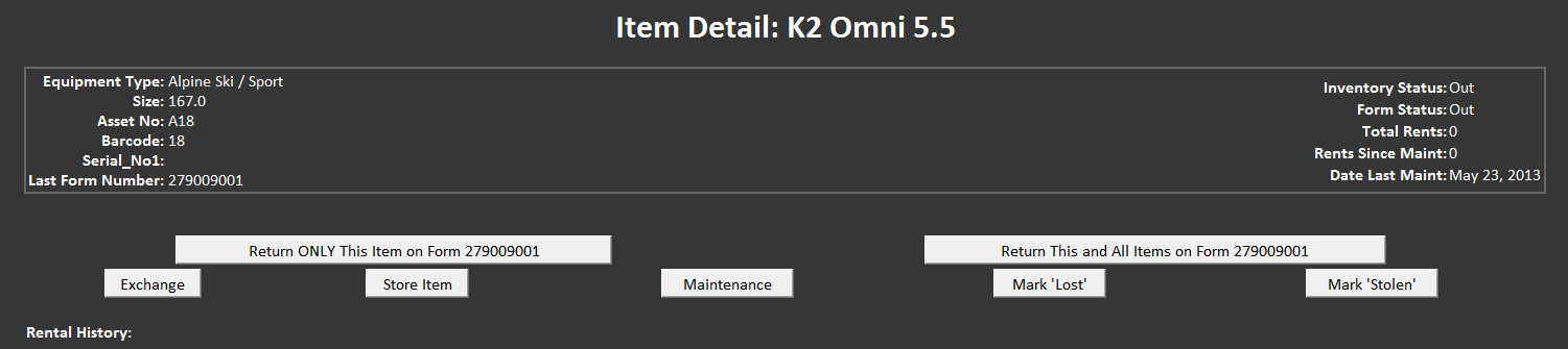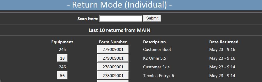 1. Scan the Rental form and click the Ret button next to the item to be returned.