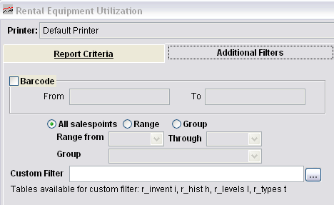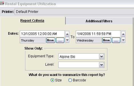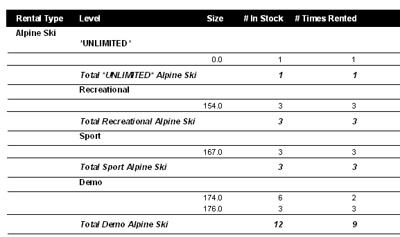 The Equipment Utilization Report provides a snapshot of the number of rentals in stock per type/level/size vs. the number of times those type/level/size combinations were rented during the specified date range. You can also summarize the report by additional fields such as Asset Number and all four Serial Number fields. These values are also available to print on the report as well. This report can be helpful in determining the most popular size and equipment type/level rentals used at a rental shop.