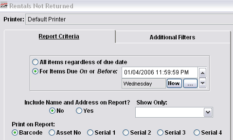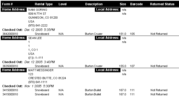 The Not Returned Report provides a list of equipment that has not been returned. A specific due date may be set in order to capture all of those rentals that were due on or before a certain date or the report can be run for all rentals not returned regardless of the due date. Guest names and addresses may be included on the report. Due date, time and Rental Shop description is also included in the report body.