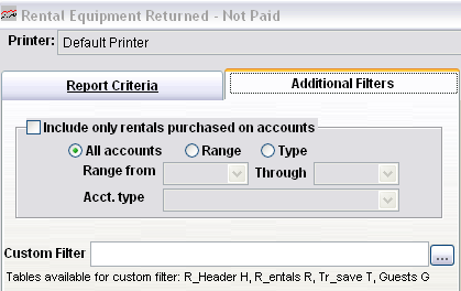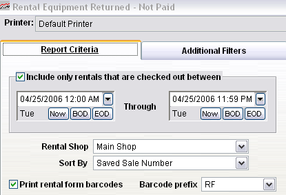 The Equipment Returned – Not Paid Report is very useful in pay-upon-return rental shops as it helps identify those contracts (Rental forms) where all equipment has been returned but the rental charges generated for the rental activity have not been paid. This report can also include a Rental form barcode for easy recall of the associated sale/reservation within the Sales application.