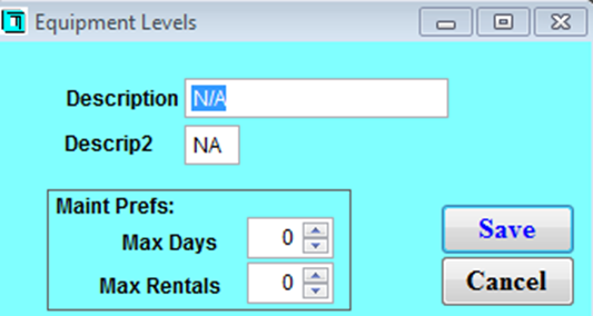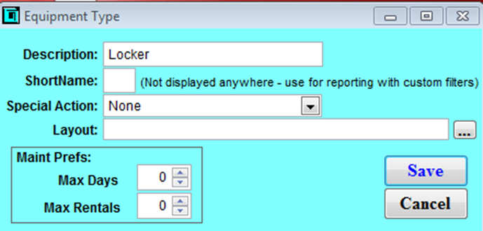 1. Create the necessary Equipment Types and Equipment Levels. (SysManager > Activities > Rental Lists). Typically the Equipment Type describes the object being rented (Locker) and the Equipment Level is generic (N/A).