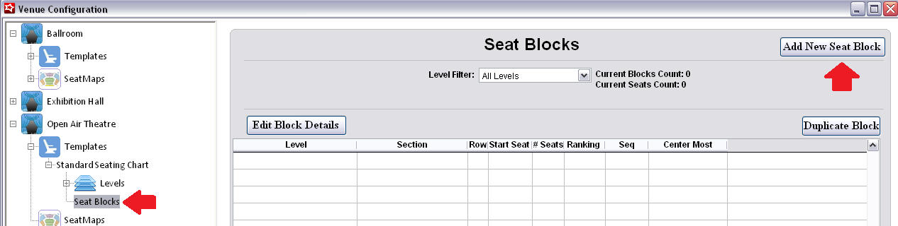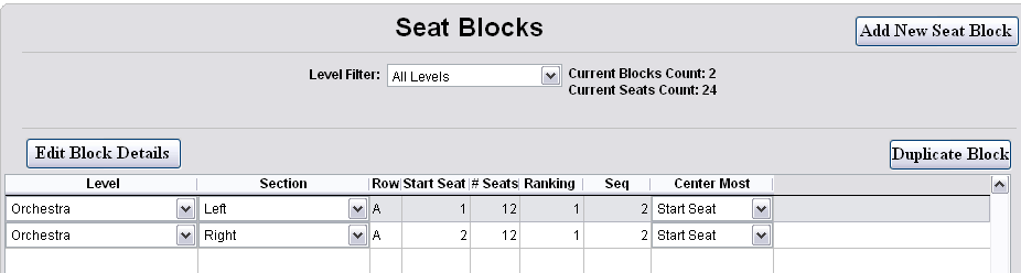 Once all Levels and Sections have been defined, it is time to create the Seat Blocks. Having a seating chart of your venue make this process much easier.