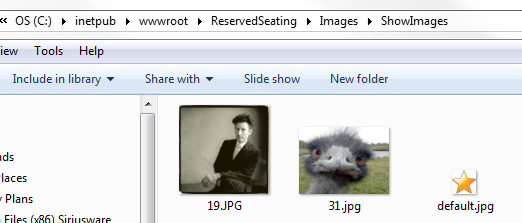 It is possible to display a picture relating to a Show on the schedule. To do so, find a small .JPG file and name it with the ShowID. Save the file in the \Images\ShowImages folder in both the E-Commerce and Reserved Seating directories installed under IIS. If no show image matching the ShowID is found, a default picture is displayed. Please ensure to have at least one image file named default.jpg located in the ShowImages folders.
