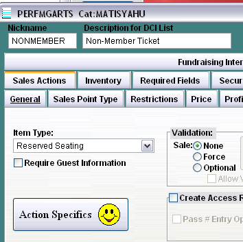 1. Start by selecting Reserved Seating for the Item Type on the Action tab. By default, Reserved Seating module items do not require guest information, but guest information can be required at the time of the sale, by checking the Require Guest Information check box.