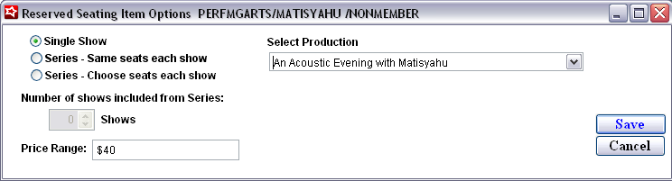 • The Single Show option requires the selection of a Production. The value entered in the Price Range field is displayed to the end-user during the booking process to provide an approximation of how much this particular ticket may cost.