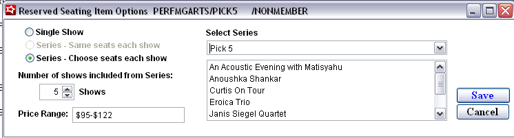 Regardless of the Series type, the Series corresponding to the ticket item must be selected along with the Number of Shows that must be booked during the ticket purchase process. The value entered in the Price Range field is displayed to the end-user during the booking process to provide an approximation of how much this particular ticket (package) may cost.