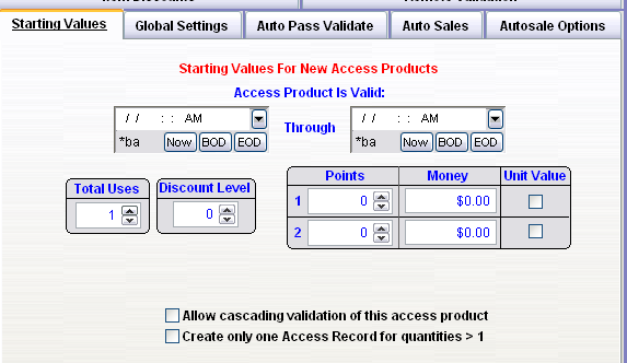 Note: A typical Access Template configuration for a Reserved Seating item would include 1 (positive one) Total Use for Starting Values, -1 (negative one) Total Use for Auto Pass Validate and Don’t Use Shifts for Autosale Options.
