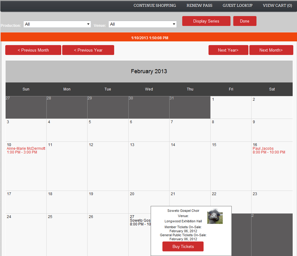 Note: The Production and Venue dropdowns can be used to filter shows on the currently selected month.