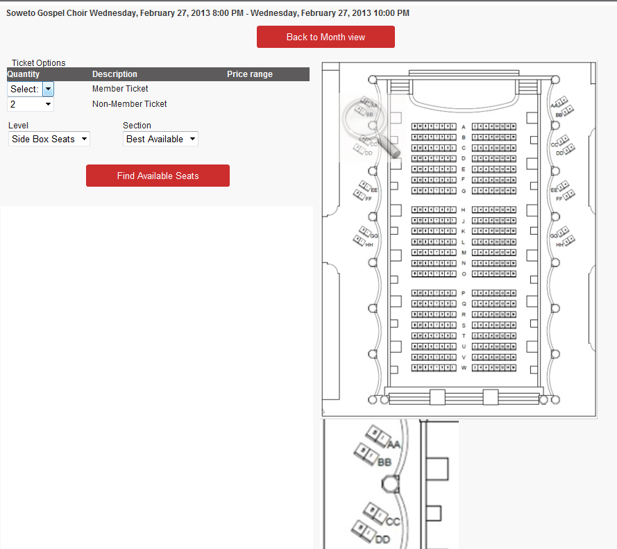 6. The system returns “the best available” seat block, but to see additional blocks click the More Options… button. If no seats are available, users receive a message detailing the lack of tickets.