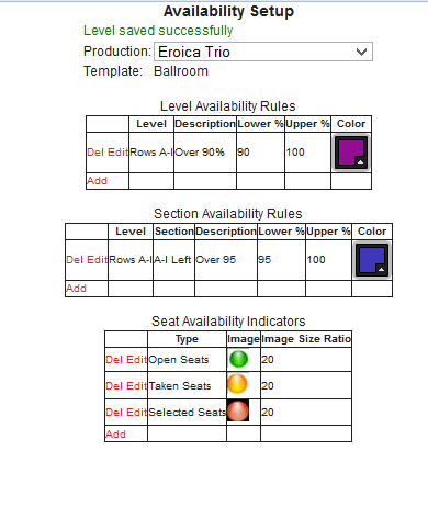 This tool can be accessed from SysManager > Activities > Reserved Seating > Production & Show Configuration > select the desired production > Productions edit screen and clicking on the Availability Setup button that opens a web-based window that allows venue administrators define Level and Section Availability Rules as well as the Seat Availability indicator images for that production.