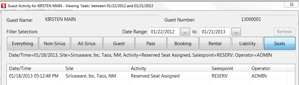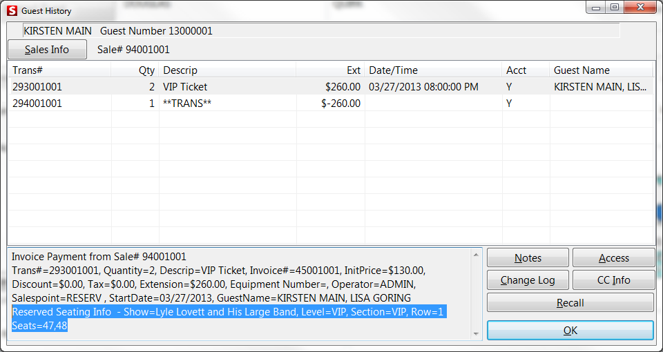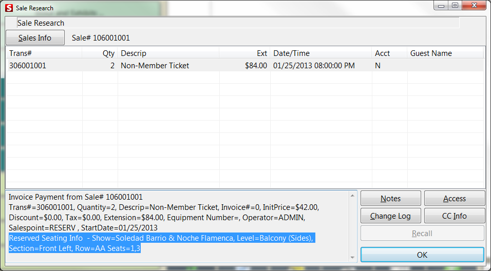 • Sale Research, convenient when a guest is not associated with the sale, displays the seating information after drilling into the sale details.