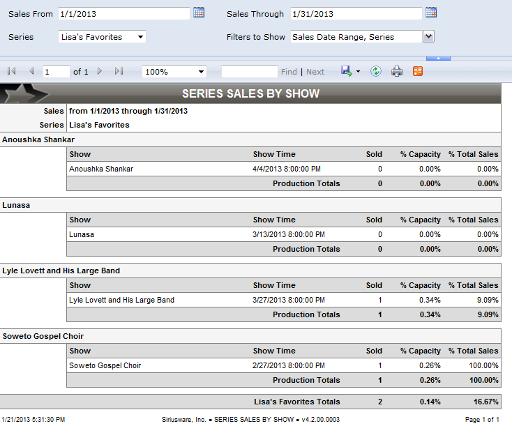 Provides data on the overall sale performance through a date range of Shows booked as part of a Series (package).