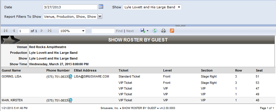 Provides a listing of guests booked into seats for a given show. If a guest is not directly attached to a ticket item, the Reservation Header guest and/or Saved Sale guest is identified as the guest for all seats included in the sale/reservation.