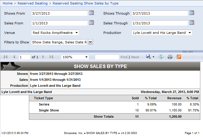 Provides statistics on the seats sold within a series vs. a single show through a given date range per show. New report that details sales and revenue statistics by ticket type (Single Show versus Series) with subtotals by show for a selected production. Percent of total figures on this report are a reflection of the sale date filters entered, so the cumulative percentages are always 100.