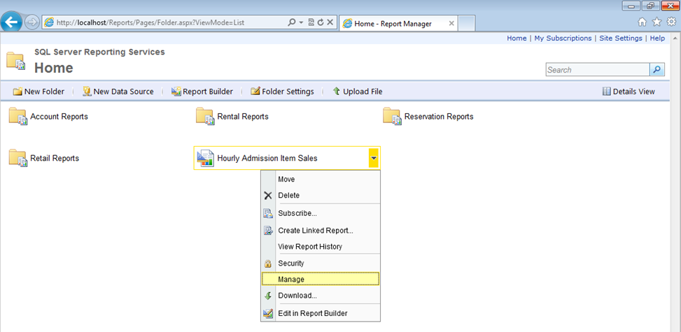 1. From the Home page (or the page on which the desired report is displayed), hover over the report name, click the dropdown arrow, and then select Manage.