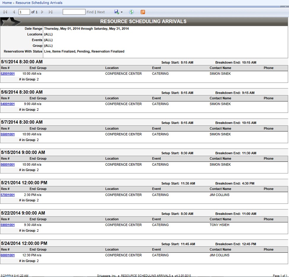 This report lists all groups arriving within a specified date range, with Reservation Header detail available. Only reservations entered into our Resource Scheduling module are included.