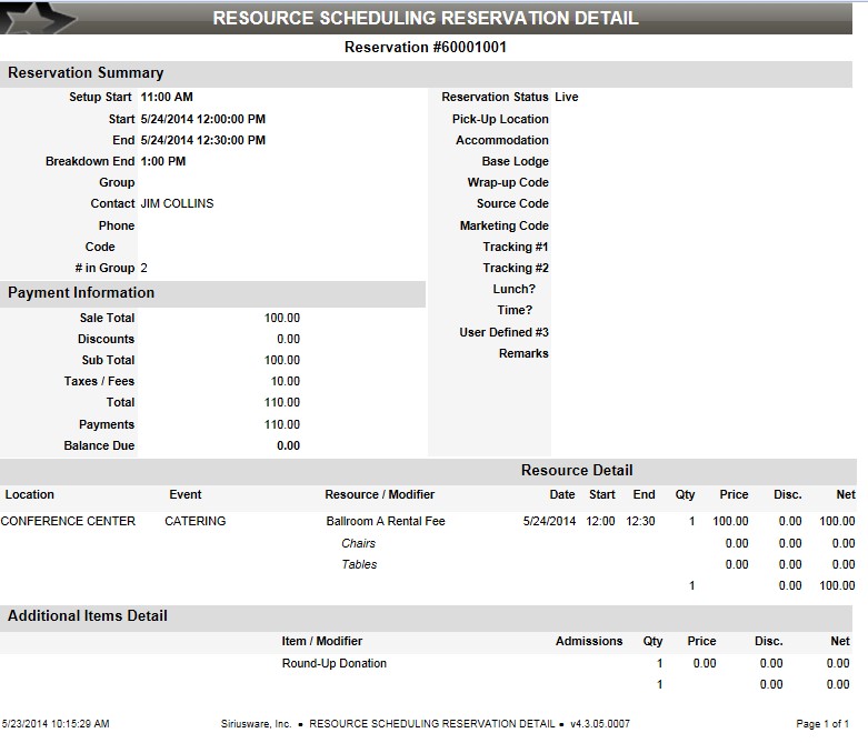 This report details all information available for a Resource Scheduling reservation, including contact information, Reservation Header details, payments made, resources reserved and additional items purchased. Only reservations entered into our Resource Scheduling module are included.
