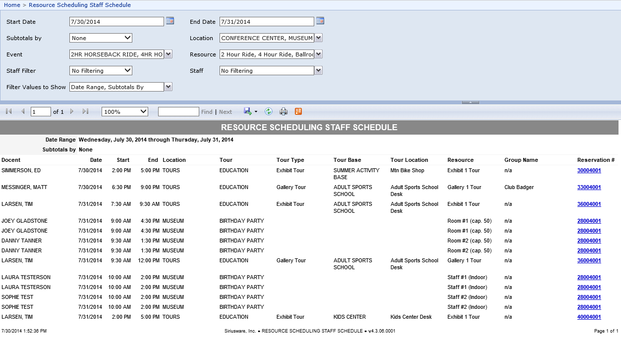 This new report displays the Resource Scheduling staff schedule. Filtering options include Date, Location, Event, Resource and Staff. The Staff filter option only lists staff that are assigned to Resource Schedule Staff items. Subtotal options group by Staff, Date or None.