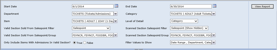 This report works similarly to the Valid and Scanned Admissions by DCI Report. However, instead of reporting based on DCI, the report illustrates Admissions broken out by specific date. The salespoint filter for the Valid section applies to the salespoint from which the valid product was originally sold. The salespoint filter for the Scanned section applies to the, “salespoint” from which it was scanned (scanners and gates are considered salespoints). The new Salespoint (Show Hidden) option allows the ability to view/select hidden salespoints in the report. An additional new filter has been added to only include items in the valid section that have admissions recorded in the transact table.
