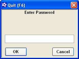 To quit the Sales program, you must be at the Product Selection screen. Pressing the F6 key brings up a dialog asking for the password in the Sales32c.INI file (see the following screen capture) the same as with F8 for the Tools dialog. Entering the proper password causes Sales to quit. Entering the wrong password removes the Password dialog and returns to the Product Selection screen.