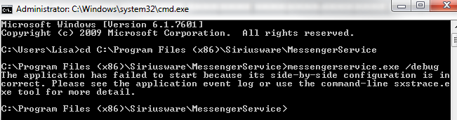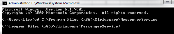 1. From a command prompt, navigate to the C:\Program Files (x86)\Siriusware\MessengerService folder (or wherever the messengerservice.exe program is located) by typing: cmd C:\Program Files (x86)\Siriusware\MessengerService