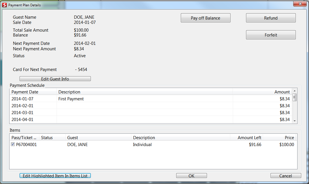 This provides detailed information on the guest, remaining Balance, Next Payment Date, Next Payment Amount, Payment Schedule and the specific pass information. You can also Pay off the Balance, Refund or Forfeit an item attached to a Payment Plan. From the Payment Plan Details dialog, you can edit gust information by selecting the Edit Guest Info button. From here you are redirected to the Guest Edit dialog. Pass edits can be made by highlighting the appropriate Pass/Ticket item with the Item selection box, and then clicking on the Edit Highlighted Item In Items List button. From here you will be directed to the Pass Inquiry form.