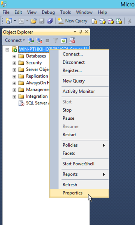 3. From Object Explorer, right-click on the top level (root) of the navigation tree and select Properties. (See screen capture below.)