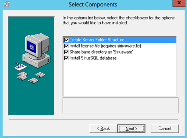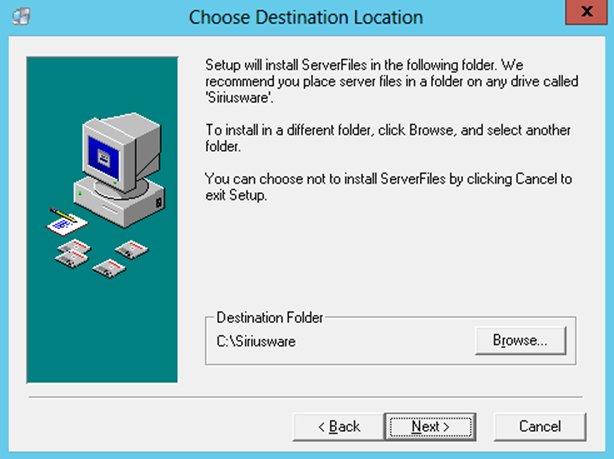 6. You are presented with the following dialog. Accept the default installation directory (C:\Program Files x(86)\Siriusware) unless you have good reasons to place it elsewhere. Click Next.