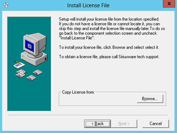 • The Siriusware 4.4 license file (only if you have a pre-made license file) – Siriusware.LIC. This option applies only if you are installing an existing SiriusSQL database. If you are installing an existing database, you already have the license.
