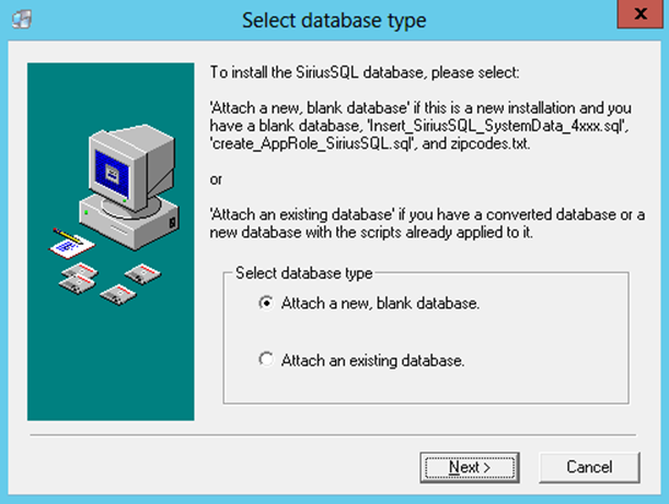 10. You are presented with the following dialog. Select whether you are attaching a new, “clean” SiriusSQL database or an existing SiriusSQL database. Click Next.