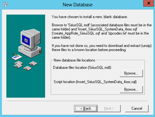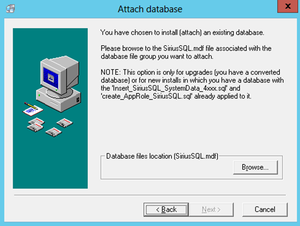 11. If you selected Attach a new, blank database in the previous step, you are presented with the following dialog. Click the Browse buttons and navigate to the SiriusTEMP directory (though you are probably already in that directory by default). Select the SiriusSQL.mdf file click Open. Then, select the Insert_SiriusSQL_SystemData.4xxx.sql file and click Open. Then, click Next. The installer attaches the database to your SQL Server.