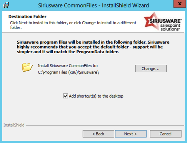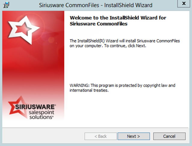 5. You are presented with the following dialog. Accept the default installation directory (C:\Program Files (x86)\Siriusware) unless you have good reasons to place it elsewhere. Click Next. Installation of Common Files application begins.
