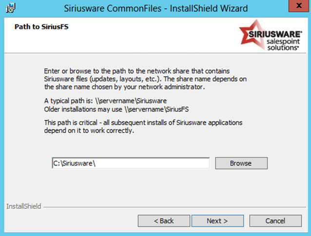 6. During installation of Common Files application, you are presented with the following dialog. If you are installing Common Files application on your SQL Server computer, you may browse the local file system by clicking the Browse button and navigating to the shared Siriusware directory on your local system. Otherwise, enter the path to the shared Siriusware directory on your network according to UNC conventions (i.e., \\servername\share).There is no need to map the Siriusware share to a local drive prior to running Common Files application. Click Next and the Common Files installation continues.