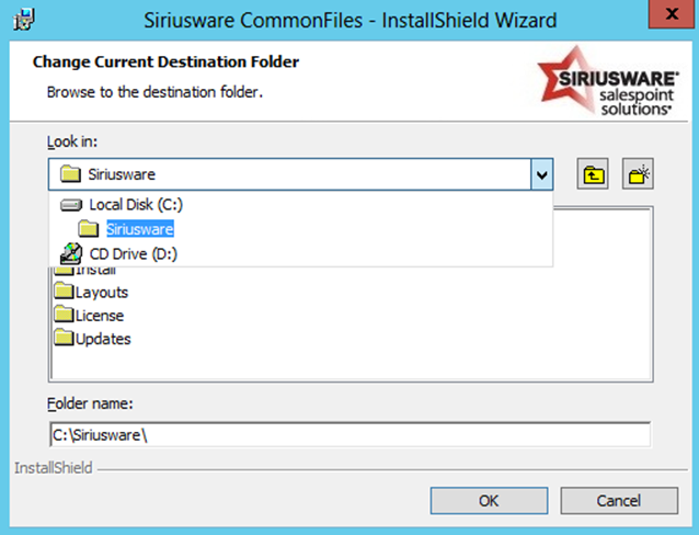 1. On the computer where you are installing Common Files (and where you are about to install Pool Service, SysManager, ReportManager or Sales), access the \Siriusware\Installs directory.