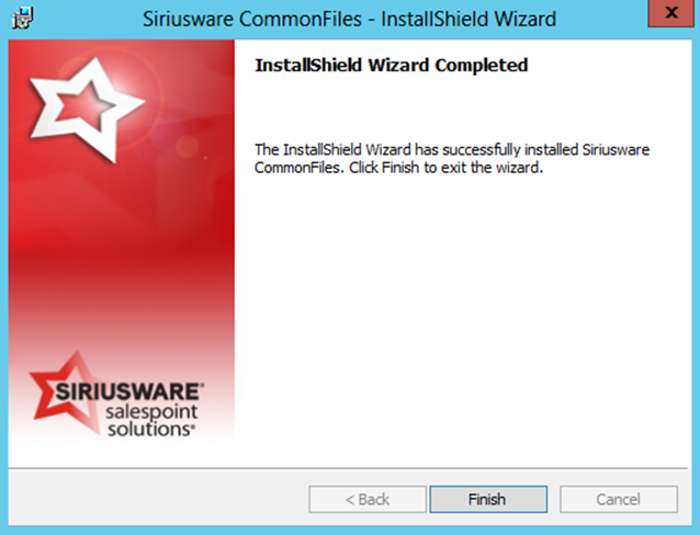 You must run the Install_Siriusware_CommonFiles_xxxx.msi installer previous to installing the remaining Salesware core installers: before Install_Siriusware_PoolService_xxxx.msi, Install_Siriusware_SysManager_xxxx.msi, Install_Siriusware ReportManager_xxxx.msi and Install_Siriusware_Sales_xxxx.msi. If more than one of these installers is run on a single computer, you need only run the Common Files installer once. You need administrator privileges on the computer where Common Files application is being installed. Before running this installer, you must have already installed SQL Server and the Server Files installer.