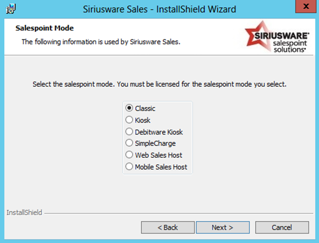 5. You are presented with the following dialog. Select which type of salespoint this is: Classic, Kiosk, Debitware Kiosk, SimpleCharge, Web Sales Host or Mobile Sales Host. Based on your selection here, you are later presented with a list of only the applicable salespoints when choosing the name for this salespoint.